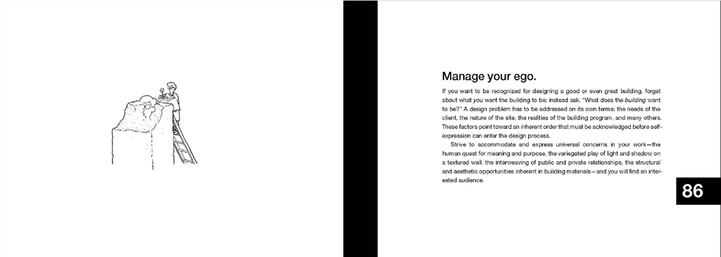 The book is laid out with one Thing per spread with an accompanying drawing on the opposite page. Some of the Things Frederick shares are concise and practical tips that would most benefit design and architecture students such as: