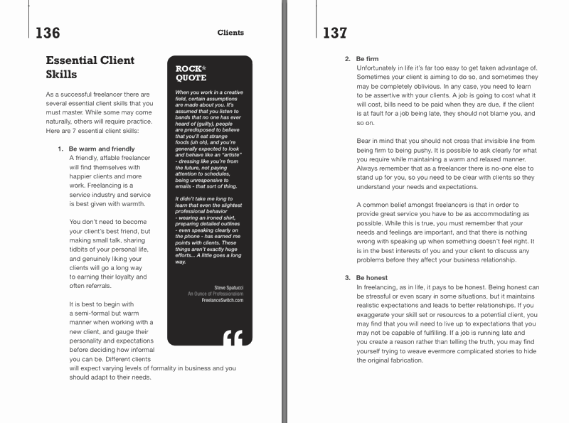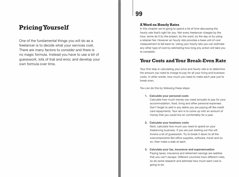 Beginning freelancers often have a difficult time determining what to charge clients and there is an entire chapter on that topic. There is a full chapter on getting paid, which also focusses on managing your business and keeping it organized with the use of a CRM, job bags and a simple ABC filing system.